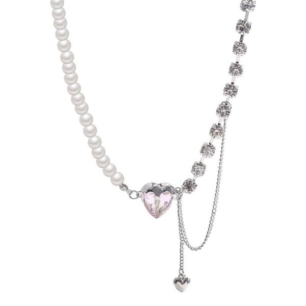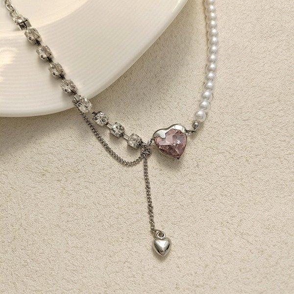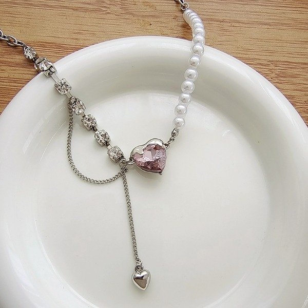 Romántico y Y2K en la misma pieza. El Pearly Love Mix combina mitad collar de perlas con mitad cadena tipo tennis de cristales, rematado por un corazón rosa facetado y una caída lariat con mini corazón colgante que aporta movimiento y brillo.