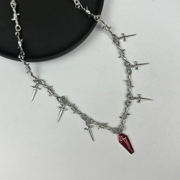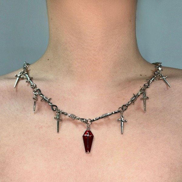 Estética gótico-punk con actitud. El Rebelión Sagrada mezcla una cadena estilo alambre de púas con mini dijes en forma de púas/estacas y un ataúd rojo como protagonista. Una pieza contundente para looks street, festivales o noche.